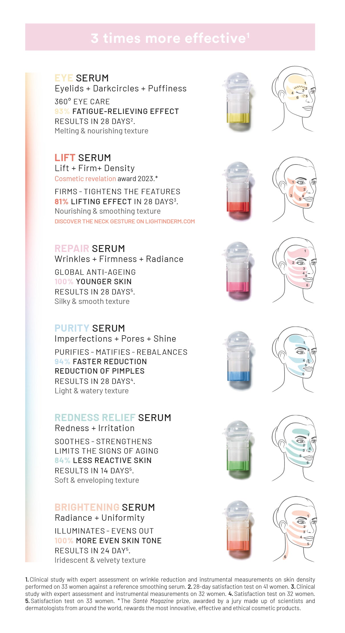 Lightinderm combines for the first time 3 technologies inspired by dermatological techniques for triple stimulation of the skin.