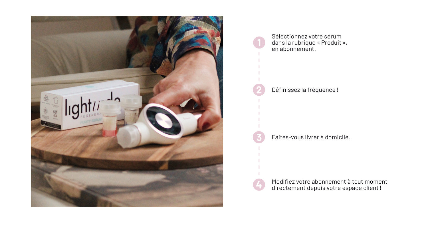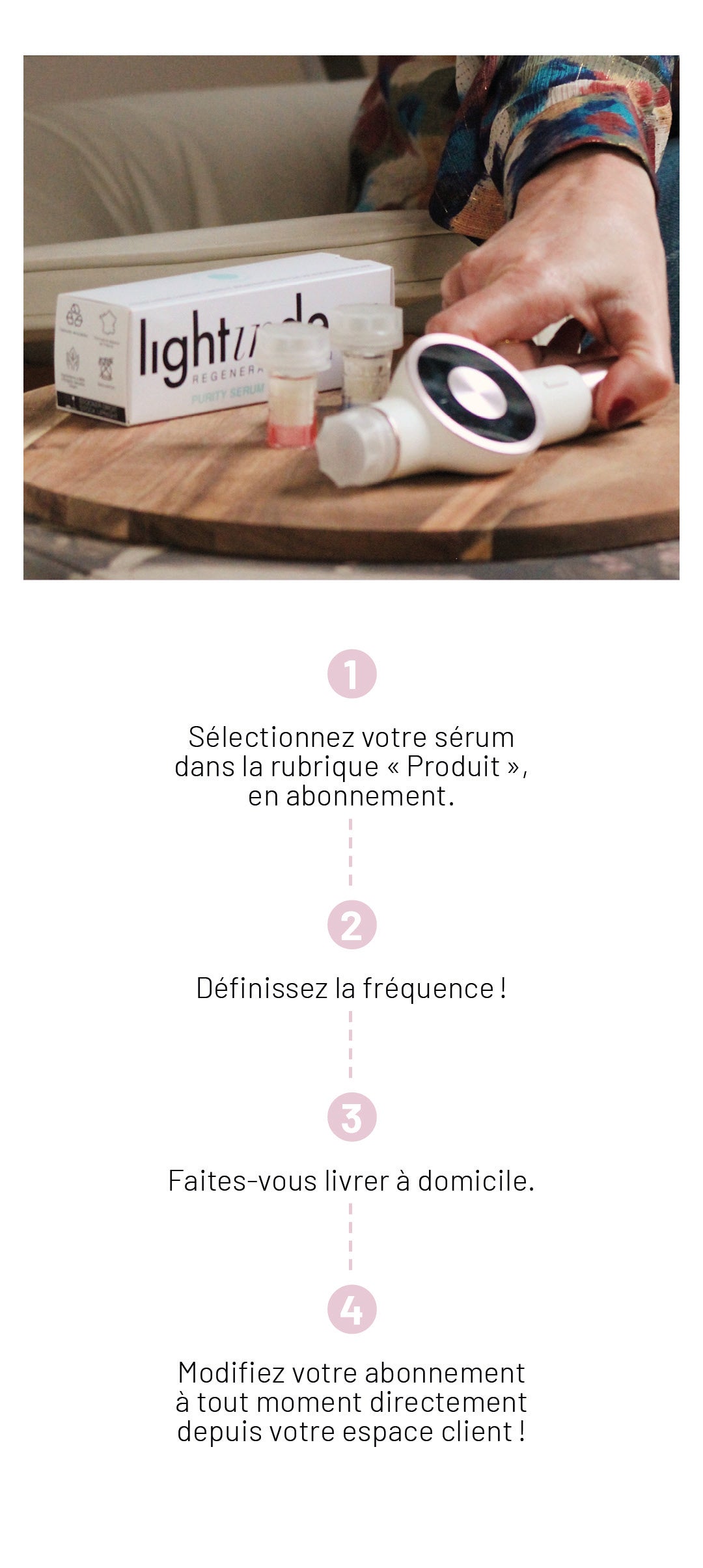 L’abonnement mensuel aux capsules de sérum vous permet de recevoir chez vous, tous les mois (ou tous les 2 mois ou 3 mois selon votre choix de rythme), vos capsules de sérum Lightinderm. Plus besoin de passer commande, vous recevez automatiquement vos capsules, à l’adresse de votre choix, sans interrompre votre soin.